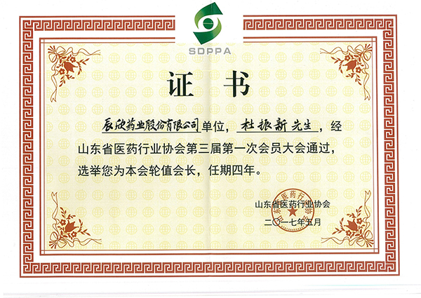 5月11日,山東省醫藥行業協會第三屆會員大會暨全省醫藥工作會議在淄博召開,會議選舉、產生協會新一屆理事會和協會負責人,辰欣藥業董事長杜振新先生當選為山東省醫藥行業協會第三屆理事會輪值會長,任期四年。